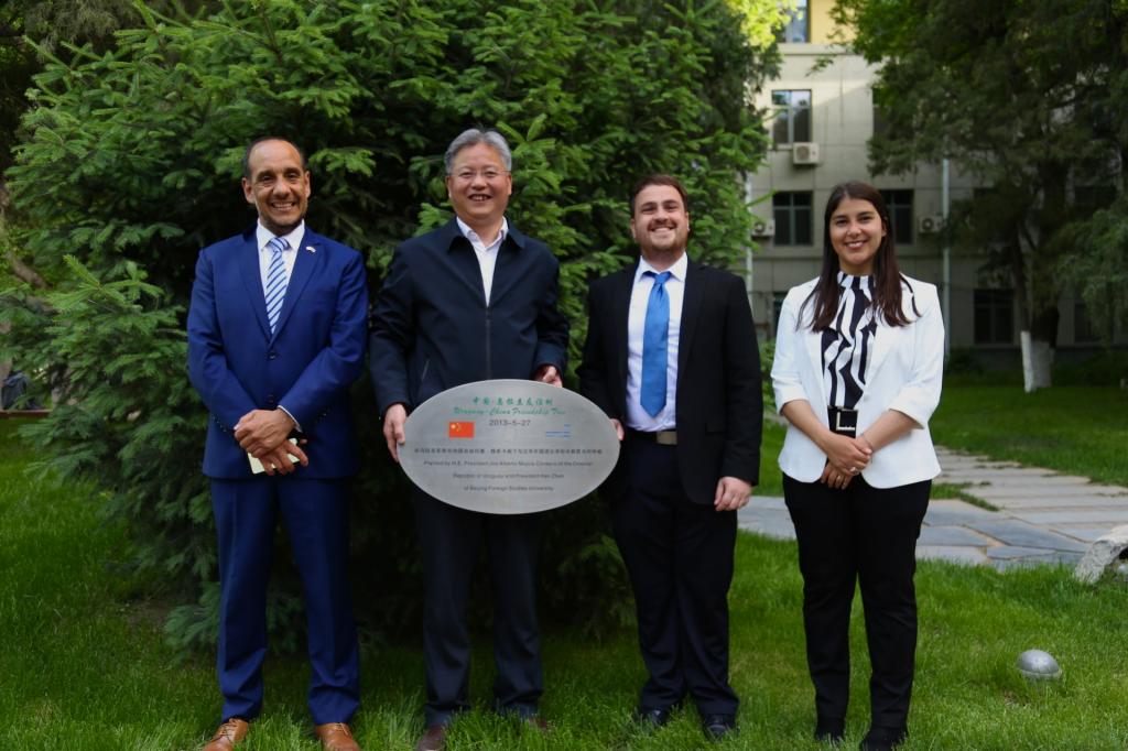讲座结束后,在九游体育官网院长常福良的陪同下,乌拉圭驻华使馆领事塞尔西奥·德亚巴列、潘慧敏老师、张哲海老师一起参观了北外校园的“中国—乌拉圭友谊树”。